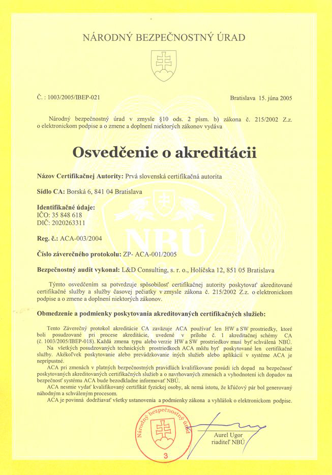 PSCA sa stala držiteľom Osvedčenia o akreditácii, ktoré pod reg. č. ACA-003/2004 vydal Národný bezpečnostný úrad SR dňa 15. júna 2005.